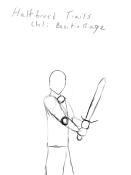 Ok, more work on the cover page. I think I improved the face shape, I still have yet to draw the face. More of the armor drawn, sword hilt drawn in and I sketched in a cape. I am having issues with how his tail and cape should look together though. should I have his tail poking out from under his cape?